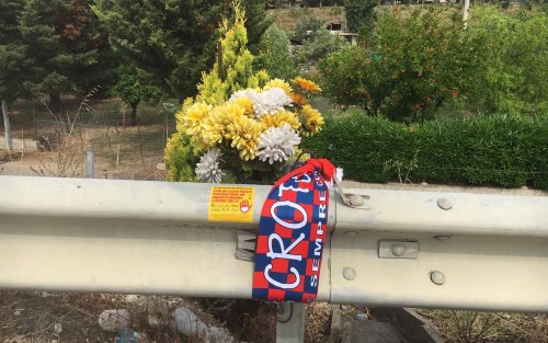 Una sciarpa del Crotone Calcio sul luogo dell'incidente a Bruno Vetere in ricordo di tutte le giovani vittime della Srrada della Morte