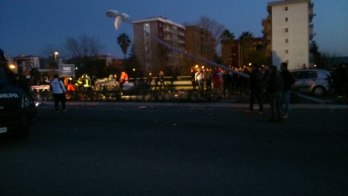 Uno spaventoso incidente ha bloccato questa sera il traffico su via Gandhi. Il bilancio è di due pali della luce abbattuti e di un ferito. Traffico bloccato in entrambe direzioni a causa di un incidente che stando alle prime informazioni raccolte sul posto avrebbe coinvolto tre automobili. Un'auto che percorreva lo "stradone di Tufolo" in direzione città avrebbe tamponato prima un'auto e subito dopo un'altra, quest'ultima, una Fiat Stilo grigia che ha avuto la peggio, è finita contro due pali della luce e si è ribaltata accartocciandosi.