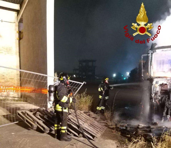 All'arrivo sul posto dei vigili del fuoco si constatava che il grande bagliore che si vedeva dalla statale 106 era dovuto all'incendio di un camion parcheggiato sul piazzale della fabbrica dismessa, dove sta avvenendo la bonifica, quindi si procedeva allo spegnimento dello stesso ed alla messa in sicurezza della zona circostante. Sul posto anche i carabinieri di Crotone.