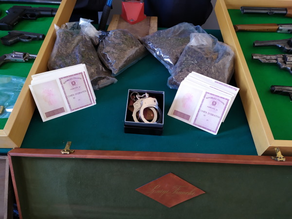 Sono stati rinvenuti tre fucili, di cui uno a canne mozze, sette pistole, centinaia di munizioni di diverso calibro, 2 mirini di precisione, 250 carte d’identità in bianco, lo strumento meccanico per la produzione di munizioni, (1) un kg di sostanza stupefacente, tipo marijuana già essiccata e confezionata.