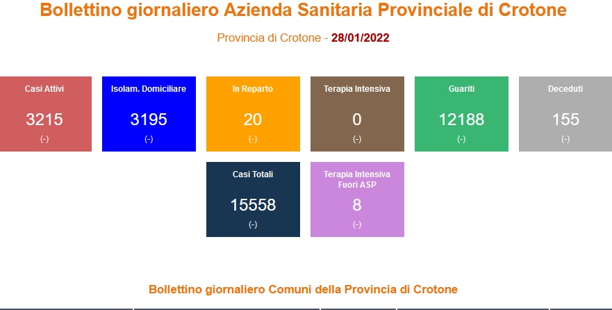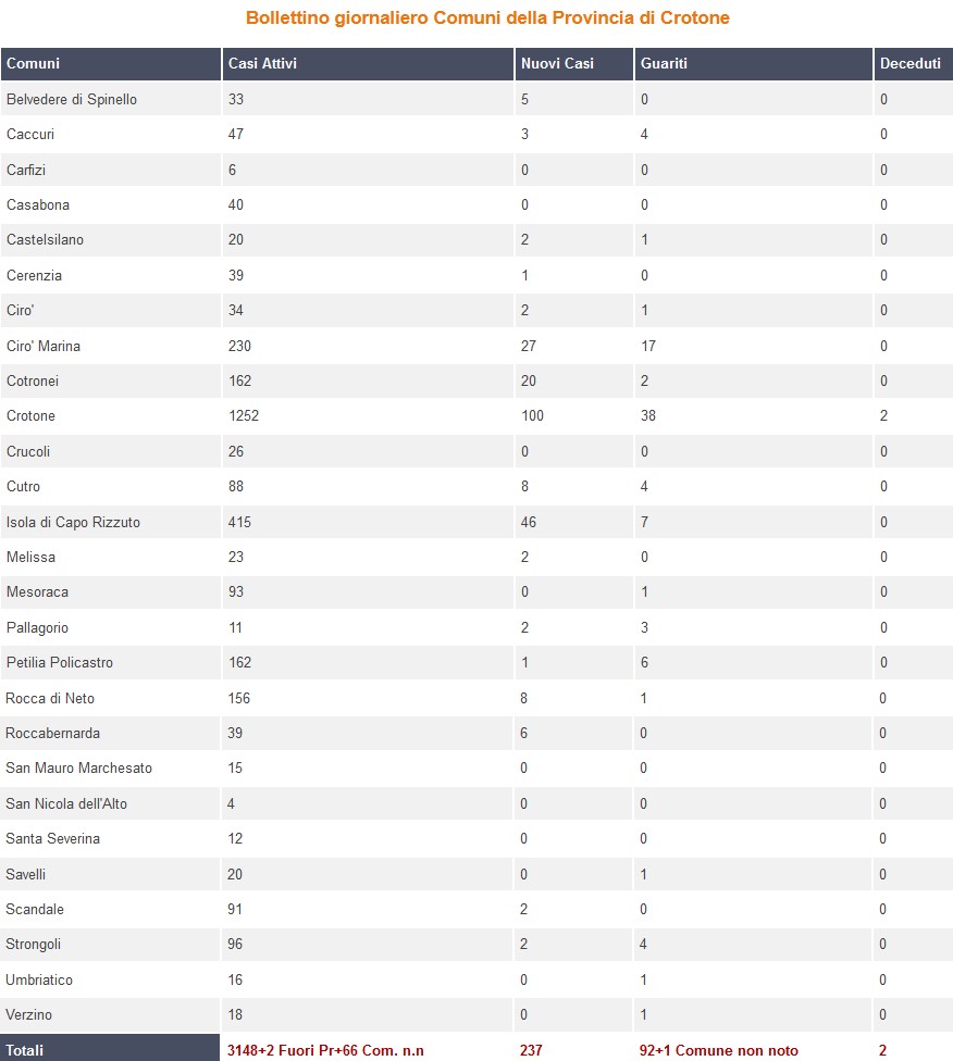 Sono 237 i nuovi casi Covid nella provincia di Crotone, 3.215 i casi attivi, di questi 20 ricoverati presso il reparto covid dell'ospedale di Crotone, 8 in terapia intensiva fuori provincia e 3.195 in isolamento domiciliare. I dati emergono dal bollettino odieno dell'ASP di Crotone.