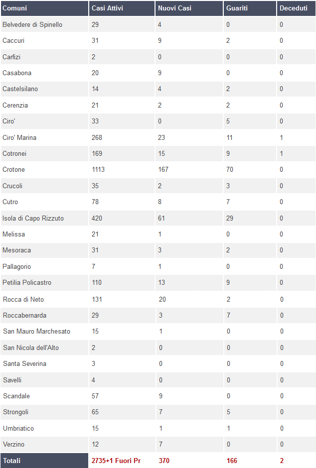 Dopo alcuni giorni di relativa stabilità, i contagi da covid riprendono a salire nel Crotonese. Oggi in provincia si registrano 370 nuovi contagi (eri erano stati 370) che portano a 2.716 i casi attivi. Di questo 20 ricoverati presso l'ospedale civile di Crotone, 5 in terapia intensiva fuori provincia.