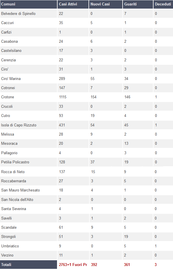 Nel bollettino odierno si registrano 361 guariti e altre 3 vittime rispettivamente di Crotone, Isola e Umbriatico.