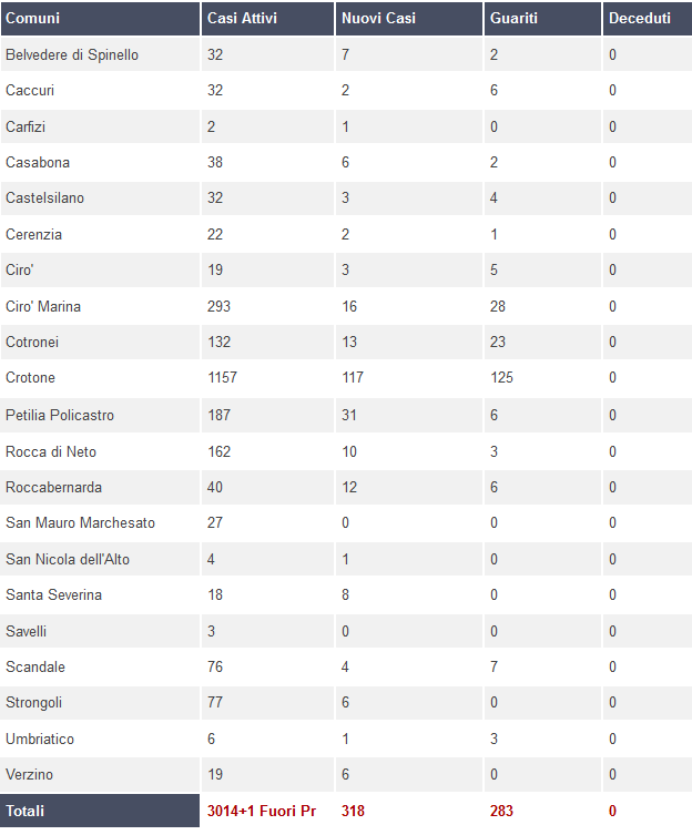 Di seguito la distribuzione dei casi covid nella provincia di Crotone