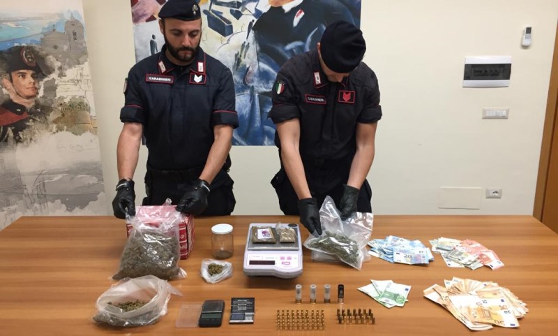 In particolare, i Carabinieri hanno effettuato un’accurata perquisizione presso la sua dimora, trovando, abilmente occultati all’interno del “vano caldaia”, diversi involucri in cellophane contenenti poco più di 570,00 (cinquecentosettanta/00) grammi complessivi di “marijuana”, circa 130,00 (centotrenta/00) grammi di “hashish”, una bilancia professionale munita del relativo piatto di pesata ancora sporco di residui di “marijuana”, 2 (due) bilancini elettronici di precisione, del materiale idoneo al confezionamento delle suddette sostanze, 75 (settantacinque) cartucce per pistole e fucili di vario calibro, nonché la somma di poco più di 3.800,00 (tremilaottocento/00) Euro suddivisa in banconote di vario taglio, ritenuta provento dell’attività di spaccio delle citate sostanze psicotrope, anche e non solo in ragione dell’insolito luogo di rinvenimento.