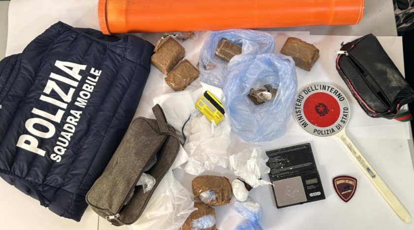 All’interno dell’immobile, gli agenti hanno sorpreso un uomo all’interno del bagno, proprio mentre stava celando diversi involucri chiusi ermeticamente, all’interno di un tubo. Prontamente, gli operatori sono intervenuti, bloccando il soggetto, quindi hanno recuperato le confezioni contenenti sostanza stupefacente: 252 grammi di cocaina e 700 grammi di hashish. Nel corso del controllo, è stato rinvenuto anche materiale per il confezionamento delle dosi, consistente in due bilancini elettronici e numerosi ritagli di cellophane, oltre ad una patente di guida risultata di provenienza furtiva.