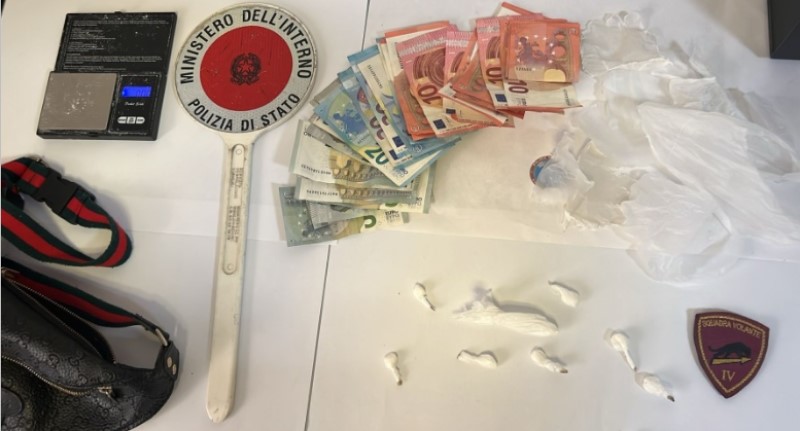 All’interno del marsupio, sono state rinvenute 9 dosi di cocaina per un totale di circa 6 grammi, materiale da confezionamento e un bilancino elettronico, intriso di sostanza stupefacente. La perquisizione ha consentito altresì di rinvenire diverse banconote di vario taglio per un totale di 285 euro, somma che è stata sequestrata in quanto ritenuta provento dell’attività di spaccio.