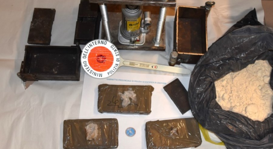 Gli agenti della Squadra Mobile, coadiuvati da personale delle unità cinofile della Questura di Vibo Valentia, hanno proceduto al controllo dell’abitazione di un cittadino albanese di 24 anni, peraltro irregolarmente presente sul territorio nazionale. Nel corso della perquisizione, gli operatori, grazie anche al fiuto del cane antidroga “ Digos “, hanno rinvenuto, ben occultati sopra un armadio, tre panetti avvolti con nastro adesivo; continuando le ricerche, hanno scoperto diversi manufatti in ferro utilizzati per pressare i panetti e per confezionare la droga, nonché un sacco contenente sostanza bianca in polvere.
