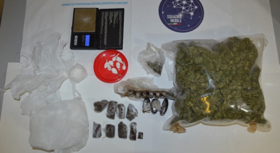 Gli agenti della Squadra Mobile, una volta fatto ingresso nell’abitazione hanno rinvenuto due buste di cellophane trasparenti contenti sostanza stupefacente del tipo marijuana del peso di gr. 295,25; n. 9 involucri di cellophane di colore bianco contenenti cocaina del peso di gr. 34,73; n. 11 involucri di cellophane trasparenti contenenti hashish del peso di gr. 103,56; n. 9 frammenti di hashish rivestiti con cellophane trasparente del peso di gr. 74,18. Inoltre, in altra parte dell’abitazione, sono stati rinvenuti anche un bilancino di precisione, diverso materiale da confezionamento e quasi mille euro in banconote di diverso taglio.