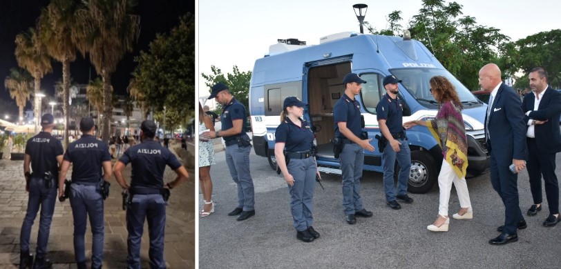 Il rafforzamento dei presidi di sicurezza, durante il periodo estivo, si è dipanato prevalentemente con l’impiego di pattuglie appiedate nelle aree del centro cittadino, sul lungomare, nei luoghi di maggiore affluenza turistica. Attenzione costante è stata rivolta ai luoghi scelti dalla “movida” giovanile nelle ore serali e notturne.