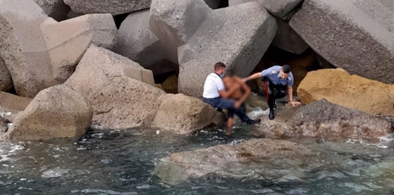 Dopo pochissimo tempo l’avvistamento da mare. Il ragazzo era nascosto tra gli scogli di protezione esterni al molo foraneo sud, disorientato e ferito al capo e ad una gamba dopo una caduta di circa 7 mt dal muraglione del molo.