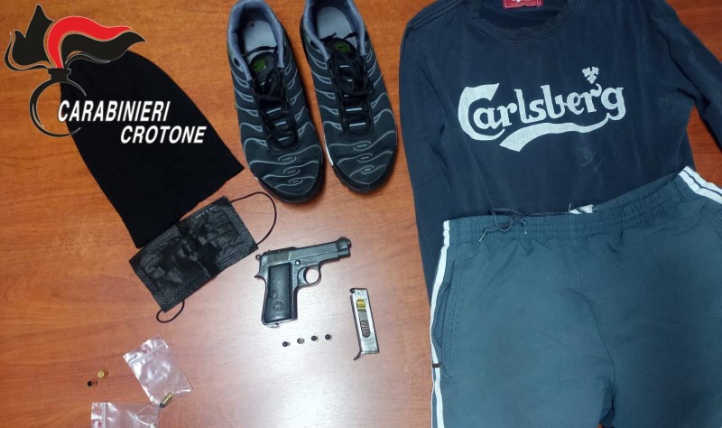In seguito i militari hanno effettuato una ricognizione dell’area prospiciente alla sua dimora, rinvenendo in un terreno agricolo adiacente una pistola semiautomatica “Beretta” del citato calibro, con la matricola abrasa, altri 7 (sette) proiettili, 1 (uno) bossolo e gli indumenti, risultati essere quelli indossati durante la commissione dei reati. L'arma e le munizioni sono state sequestrate per consentire gli esami dattiloscopici e le apposite perizie.