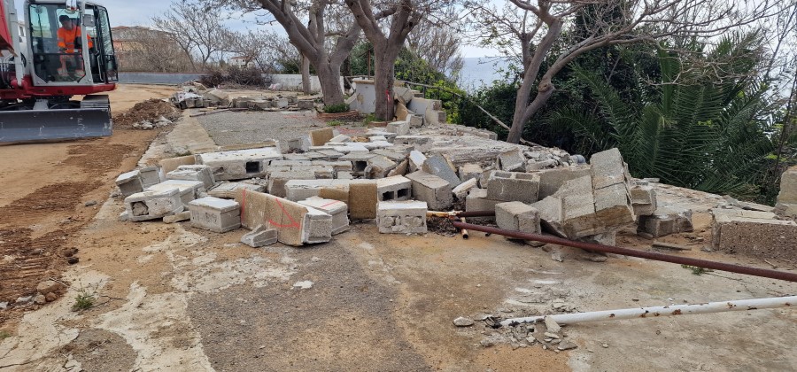 Ruspe in azione a Le Cannella per l’inizio dell’abbattimento di alcuni piccoli manufatti abusivi realizzati negli anni dai residenti: si tratta per lo più di muretti divisori, docce, parcheggi e verande, il tutto realizzato in maniera totalmente abusiva sul lungomare, dal lato bellavista.