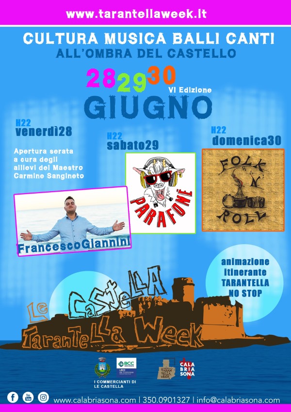 Ritorna a Le CASTELLA un appuntamento ormai entrato nel cuore degli appassionati provenienti da tutta la Regione, il "Le Castella Tarantella Week" con la sua sesta edizione che si svolgerà dal 28 al 30 Giugno.