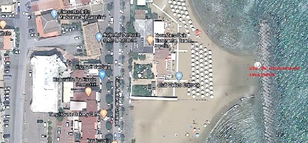«Una cava di macine è stata rinvenuta, in modo casuale, giorno 26 giugno 2020 a CROTONE, sul litorale cittadino, in corrispondenza dell’antico Convento dei Carmelitani (il cosiddetto Lazzaretto), che sorgeva fuori le mura della città, sulla via per Capo delle Colonna.