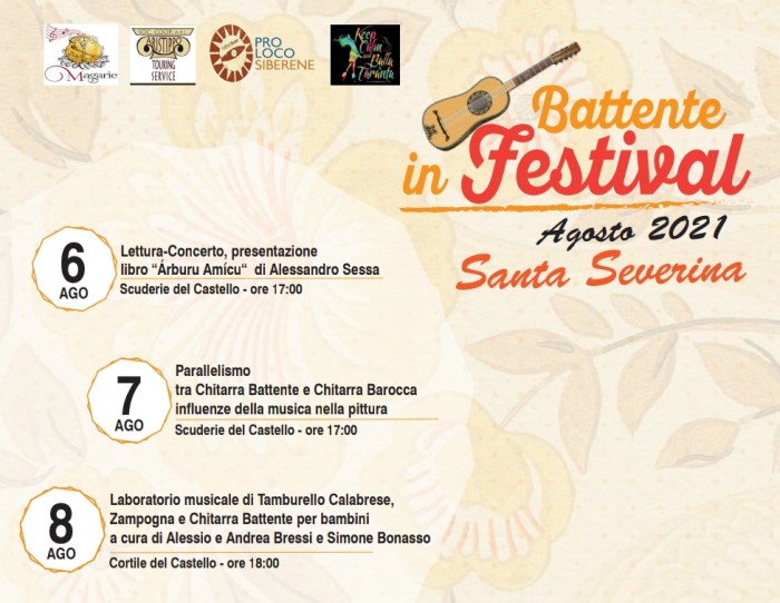 Il 6,7 e 8 Agosto prenderà il via la prima edizione del Battente in Festival a Santa Severina. L’idea nasce dall’incontro tra Simone Bonasso e Pino Turco che in una Domenica dello scorso Maggio, incontratisi per un pranzo di lavoro a Santa Severina, fantasticavano sull’idea di voler organizzare in piazza Campo un festival interamente dedicato alla chitarra battente.