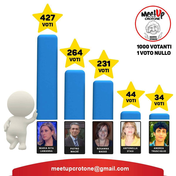 Maria Rita Lamanna con 427 è da oggi la candidata a sindaco del meetup Gruppo Storico, Pietro Macrì ha ottenuto 264 voti, Rosanna Basso 231, Antonella Stasi 44 e andrea Trusciglio 34.