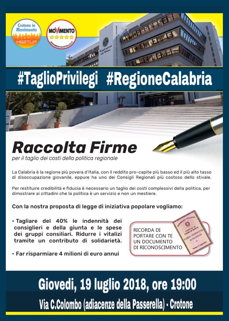 L'iniziativa del Meetup "Crotone in Movimento" partirà domani 19 luglio alle ore 19,00 in via Cristoforo Colombo (nei pressi della passerella) dove saranno allestiti dei punti per la raccolta delle firme. I cittadini che vorranno firmare dovranno avere con se un documento di riconoscimento.