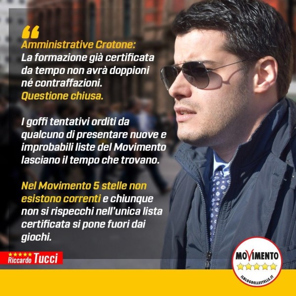 «C’è un’unica lista del MoVimento 5 Stelle in campo per le amministrative di #Crotone e fa capo al candidato sindaco Andrea Correggia. La formazione già certificata da tempo non avrà doppioni né contraffazioni. Questione chiusa.
