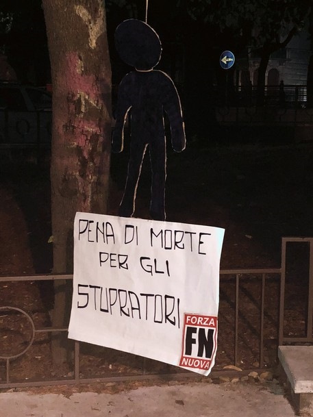 Una sagoma nera impiccata e un cartello con la scritta "Pena di morte per gli stupratori" con la sigla Forza Nuova. E' l'immagine apparsa in un giardino pubblico nel centro di Catanzaro.