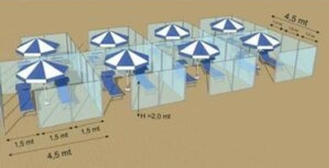 Si tratta di box trasparenti realizzati con pareti di plexiglass e profili in alluminio. L'ombrellone sarebbe "isolato" all'interno di questi box. Ogni box ha 4 lati da 4,5 metri e un'apertura su un solo lato di 1,5 metri. I pannelli per costruire i box sono alti 2 metri e larghi 1,5 metri.