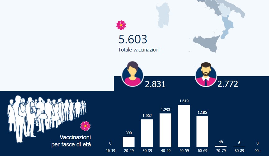 Nei sei punti di somministrazione individuati sono stati vaccinati 2.831 donne e 2.772 uomini, in gran parte operatori sanitari e sociosanitari delle strutture ospedaliere regionali. La Calabria risulta l'ultima regione italiana per numero di vaccinazioni eseguite in proporzione alle dosi già consegnate e quindi disponibili.