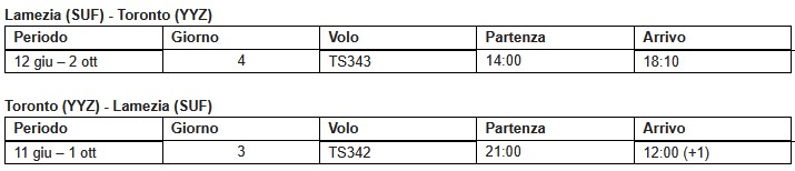 "I voli da Lamezia costituiscono da oltre 30 anni l'unico collegamento no-stop dalla Calabria, Lamezia a Toronto, rappresentando un servizio consolidato sul mercato italiano che garantisce ai viaggiatori un'offerta competitiva e di qualità per raggiungere Toronto - commenta Tiziana Della Serra, MD Rephouse e Head Sales & Marketing - Air Transat opererà dal 12 giugno fino al 2 ottobre con 1 volo no-stop a settimana Lamezia-Toronto, il giovedì. Tutti i voli sono disponibili in GDS".