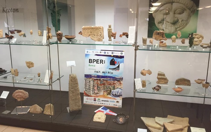 Sempre da ieri, inoltre, il manifesto dei Bper Banca Optimist European Championship di Crotone fa bella mostra di sè in una vetrina d'eccezione in cui compaiono una maschera apotropaica della tradizione magno greca, una coppa per il vino che raffigura un atleta che si deterge e una copia del famoso cippo di Faillo, il cui originale è conservato nel Museo di Capocolonna.