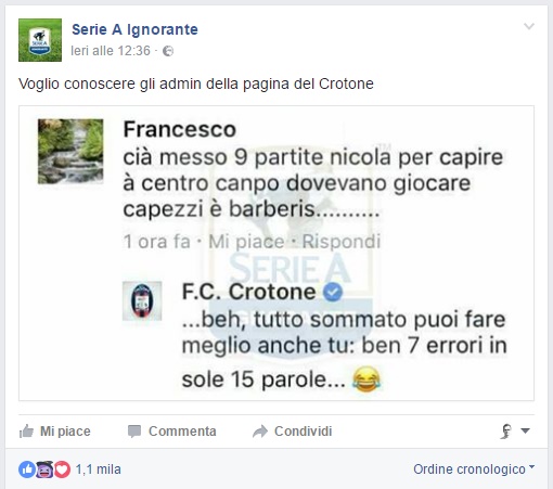 Basta cliccare sul sito goliardico "Serie A Ignorante" per trovare lo screenshot di uno scambio di vedute tra un tifoso del Crotone e l'insensata quanto inqualificabile risposta della F.C. Crotone Fan Page, la pagina UFFICIALE della società calcistica.