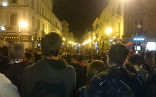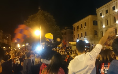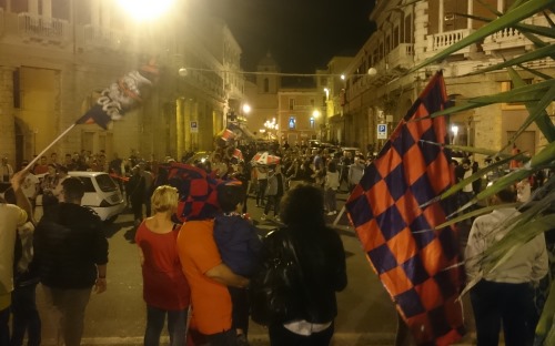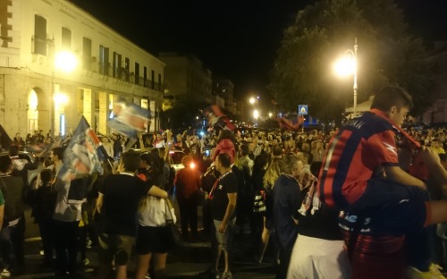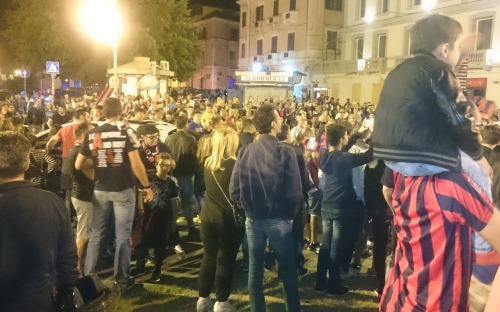 E mentre sul campo esplode la gioia dei giocatori e della società, in città è festa grande. Piazza Pitagora si colora di rossoblu tra le note di Rino Gaetano. Sciarpe e striscioni, bandiere e trombette danno il via alla parata finale.