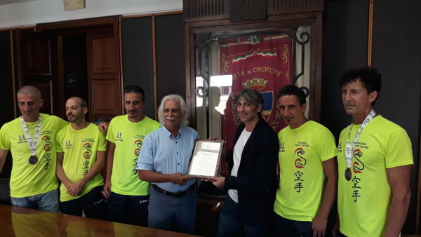 «Come tradizione dell'Amministrazione Pugliese con tutti gli sportivi che si affermano a livello nazionale ed internazionale anche gli atleti della Accademia Karate Crotone reduci dai Campionati d'Europa Master che si si sono tenuti a Torino sono stati ricevuti nella Casa Comunale per ricevere il ringraziamento della comunità cittadina per i prestigiosi risultati conseguiti.