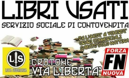 Anche quest’anno è ripartito, come sempre, lo storico servizio politico organizzato da Forza Nuova. Un servizio di conto-vendita libri scolastici usati che ha un unico obbiettivo: dare un'alternativa alle famiglie degli studenti attanagliate dalla crisi e vittime sempre più del caro scuola e della speculazione delle nuove edizioni. La sede dell’iniziativa sarà sempre quella storica di Via Libertà. Sostanzialmente invariati sono rimasti anche i giorni e gli orari di apertura; dal 22 agosto sino a metà ottobre e da lunedì a venerdì dalle 9:15 alle 13:00 e dalle 16:15 alle 20:00 (sabato solo la mattina). Per maggiori informazioni contattare il 3282028153.