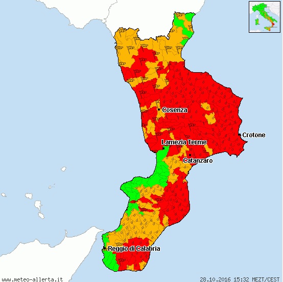 Come riporta il sito web Meteo-Allerta.it in particolare tutta la provincia di Crotone è interessata da ALLARME ROSSO per piogge molto intense e ALLARME ARANCIONE per forti raffiche di vento superiori a 75 km/h. Attenzione anche nella Sila Greca, la Sibaritide, l'area di Punta Stilo, l'Aspromonte meridionale e la Locride.