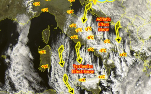 Il meglio deve ancora arrivare. Possenti masse d'aria fredda di origine siberiana si stanno rovesciando in queste ore sul Mediterraneo centrale, originando nuvole colme di neve e temperature sotto lo zero termico in molte regioni d'Italia.