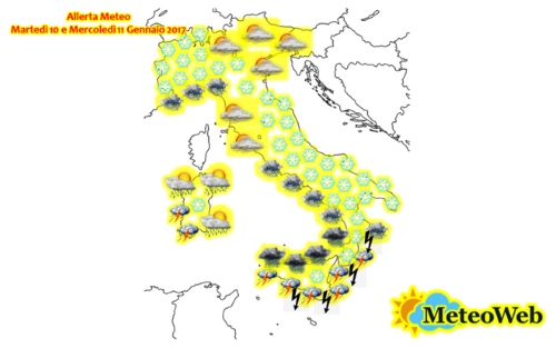 La potente bassa pressione che origina il ciclone tirrenico, richiamerà sia il nucleo molto freddo del burian siberiano, ora fermo sui Balcani, sia correnti di aria umida e temperata provenienti dall'Atlantico. La combinazione dei due fenomeni darà origine tra il tardo pomeriggio di oggi 10 gennaio e domani 11, a possenti precipitazioni su Calabria, Sicilia, Sardegna e Campania.