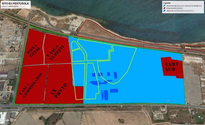 L'intero sito Pertusola si estende per circa 49 ettari, ma la bonifica riguarderà solo 21 ettari di terreno, sul resto del sito (area celeste foto2) non è previsto nessun tipo di intervento di rimozione o di trattamento. Nel Pob Fase 2, una volta trattate le aree menzionate (vasca del commissario, zona gessi, vasca ferriti, area ex-fitorimediazione) tutto il sito sarà coperto e messo in sicurezza secondo la tecnica del capping.
