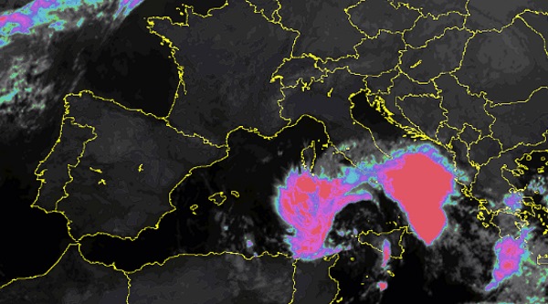 Intanto il vortice ciclonico che attira masse cariche d'acqua si trova tra la Sicilia e la Tunisia, mentre una sacca di bassa pressione al largo di Punta Le Castella continua ad ingrossarsi mantenendo il fronte nuvoloso ancorato alla Calabria. Per questo condizioni meteo estreme ancora per l'intera giornata di oggi 5 ottobre. Avremo ancora piogge torrenziali per violenti temporali nelle zone ioniche di Sicilia e Calabria, e maltempo diffuso in tutto il Centro/Sud (Sardegna compresa). L'allerta è alta e si raccomanda tutti di non uscire di casa. Verrà giù l'apocalisse.