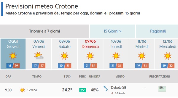 Quindi tra venerdì e domenica nel Crotonese il tempo sarà bello e soleggiato, con temperature in graduale aumento: già sabato a Crotone si toccheranno i 28 gradi, e nella giornata di domenica la colonnina di mercurio dei termometri si spingerà in su fino a raggiungere i 30 gradi. Cosa succederà la prossima settimana?
