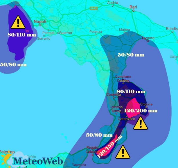 In particolare, nel pomeriggio e poi nella sera di domenica, si abbatteranno fenomeni violenti in forma di nubifragio sui settori meridionali regionali ma poi soprattutto su quelli ionici centro settentrionali dal Catanzarese, fino al Nord Crotonese, con la caratteristica di essere violenti e intensi in unità di tempo ridotta. Saranno possibili accumuli di 100 mm in poche ore. La veemenza delle precipitazioni e anche la consistenza delle stesse con accumulo fino a circa 200 mm entro lunedì, potranno causare senz’altro disagi importanti per allagamenti, smottamenti e magari anche rischio alluvioni per straripamenti corsi d’acqua, specie minori.