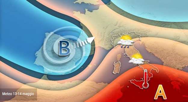 Una profonda sacca di aria calda e umida proveniente dall'Africa si sta facendo largo nel Mediterraneo centrale tra due vortici di bassa pressione stabilizzati uno sulla penisola iberica e l'altro sui paesi scandinavi.