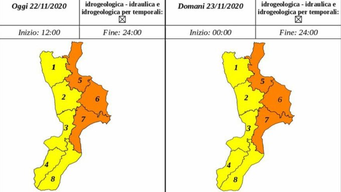 Nel nuovo bollettino inviato dalla Protezione Civile, il livello di allerta per tutta l'area ionica della Calabria centro-settentrionale passa da rosso ad arancione. L'allerta arancione si estende dalle ore 12:00 di oggi e per tutta la giornata di domani 23 novembre.