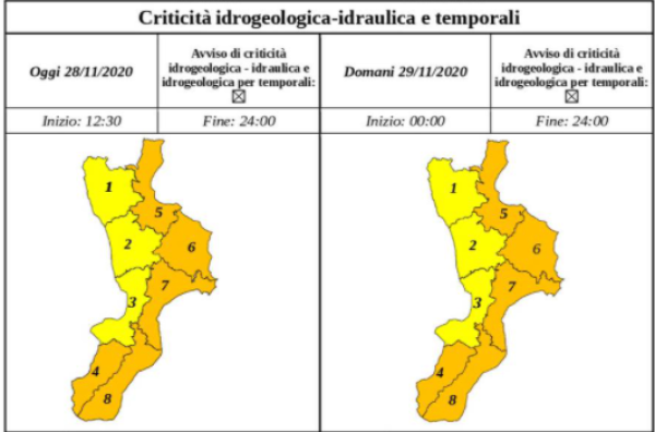 Il Dipartimento della Protezione Civile ha emesso un messaggio di allerta ARANCIONE per condizioni meteo avverse con aumento dei fenomeni critici a partire dalle ore 12:00 di oggi e valide per l'intera giornata di domani 29 novembre sull'intera fascia ionica della Calabria e sull'area tirrenica della sola provincia di Reggio Calabria.