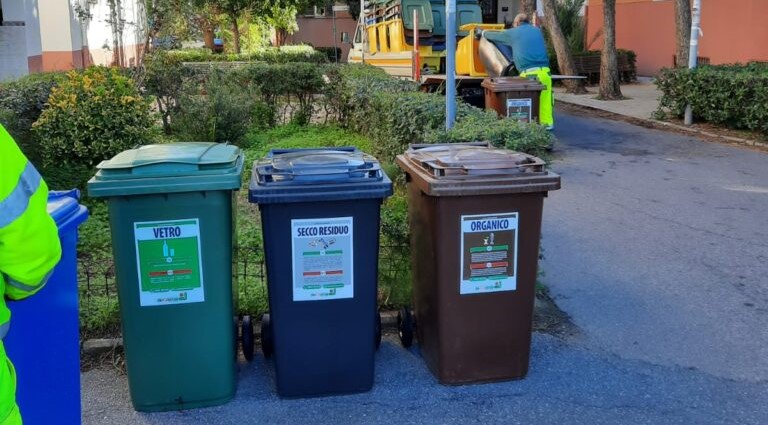 Ogni postazione è composta di cinque carrellati di diverso colore secondo la tipologia di rifiuto: giallo per plastica e alluminio, verde per il vetro, blu per la carta, marrone per l’organico, grigio per il secco indifferenziato.