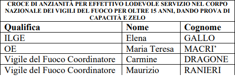 Inoltre, il personale in servizio al quale è concessa la Croce di Anzianità per aver prestato effettivo lodevole servizio nel Corpo nazionale dei Vigili del Fuoco per oltre 15 anni, dando prova di capacità e zelo, sono: