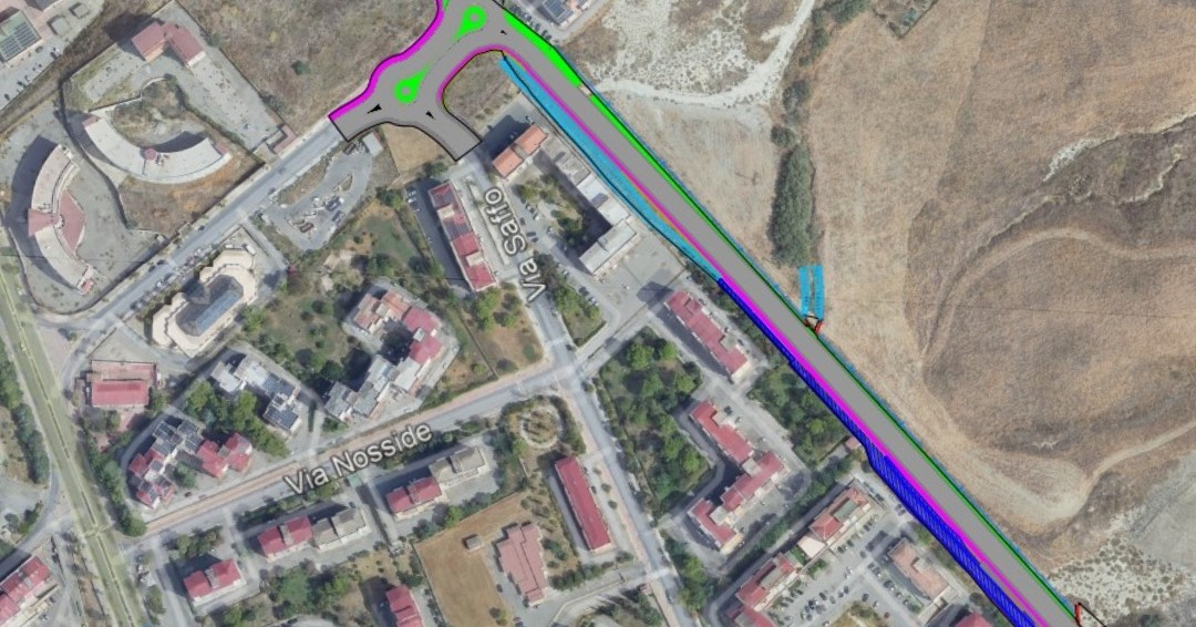 Previsti, inoltre, due attraversamenti stradali e un adeguamento delle sezioni dei canali esistenti mediante il ridimensionamento e rivestimento degli stessi. Inoltre è prevista una rotatoria del tipo a doppia goccia per regolamentare l’incrocio in corrispondenza dell’Anmic, tra la realizzanda strada e via Saffo.