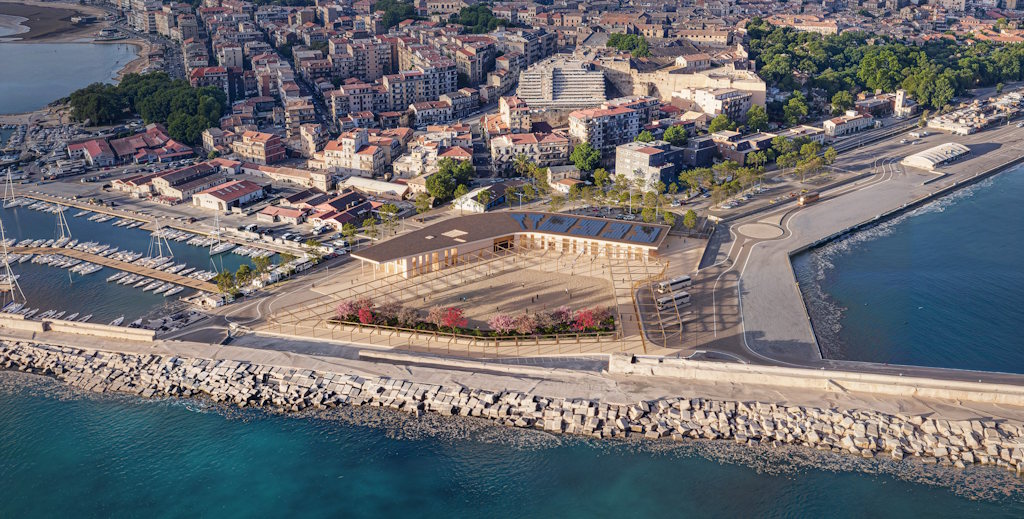 Nel dettaglio, è prevista una struttura leggera a pensilina per la definizione degli spazi aperti, con funzioni di ombreggiamento e illuminazione, capace di garantire flessibilità e riconoscibilità agli spazi pubblici. Dal punto di vista architettonico, l’edificio si svilupperà come un volume unitario con due fronti principali: uno rivolto verso la città e la marina, con funzione rappresentativa, e l’altro aperto verso il mare e un’arena destinata a eventi all’aperto. La copertura, leggermente inclinata, integrerà pannelli fotovoltaici, contribuendo all’efficienza energetica dell’intervento. Nel complesso, il progetto punta a coniugare qualità architettonica, sostenibilità e integrazione con il paesaggio costiero, delineando una nuova identità per il waterfront di Crotone.